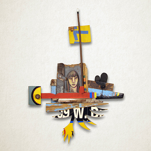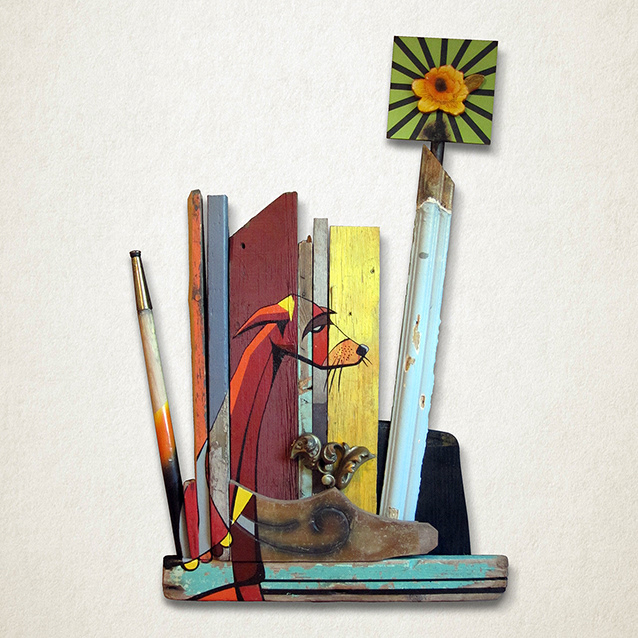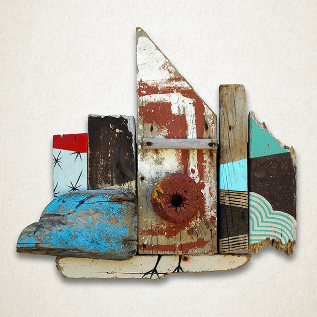 Reclaimed signage/driftwood/shoe soles/book/door knob, sign paint.