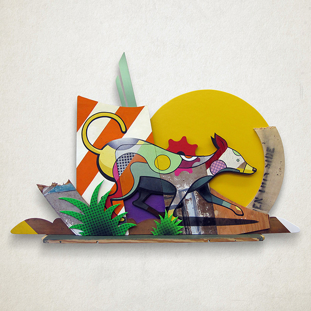 Reclaimed signage/wood, spray paint, acrylic paint.
