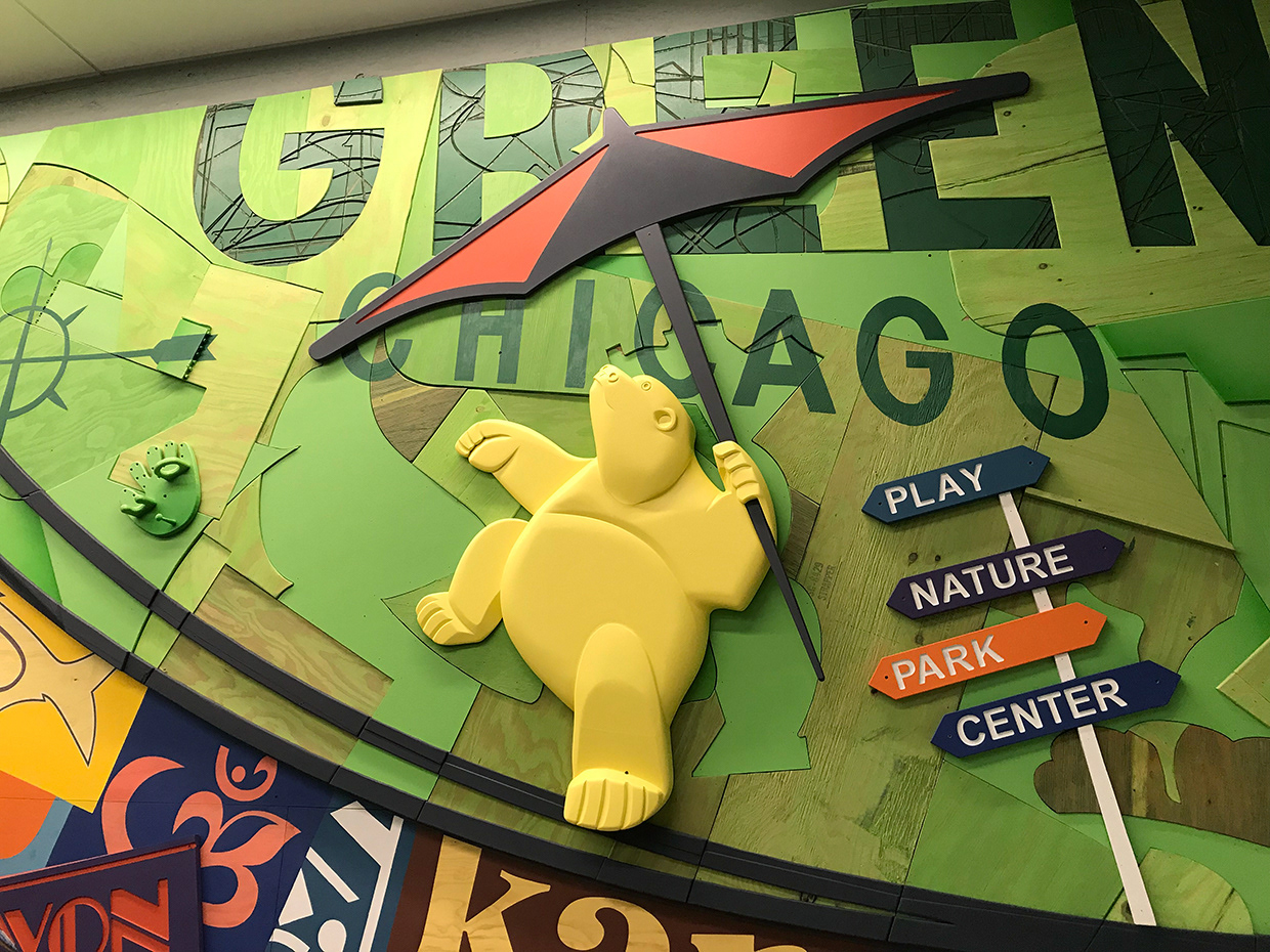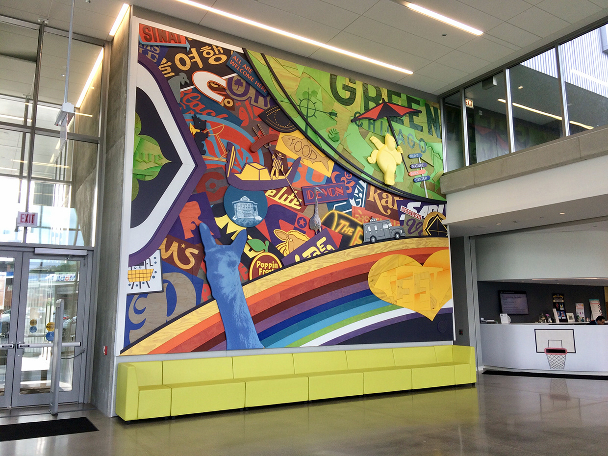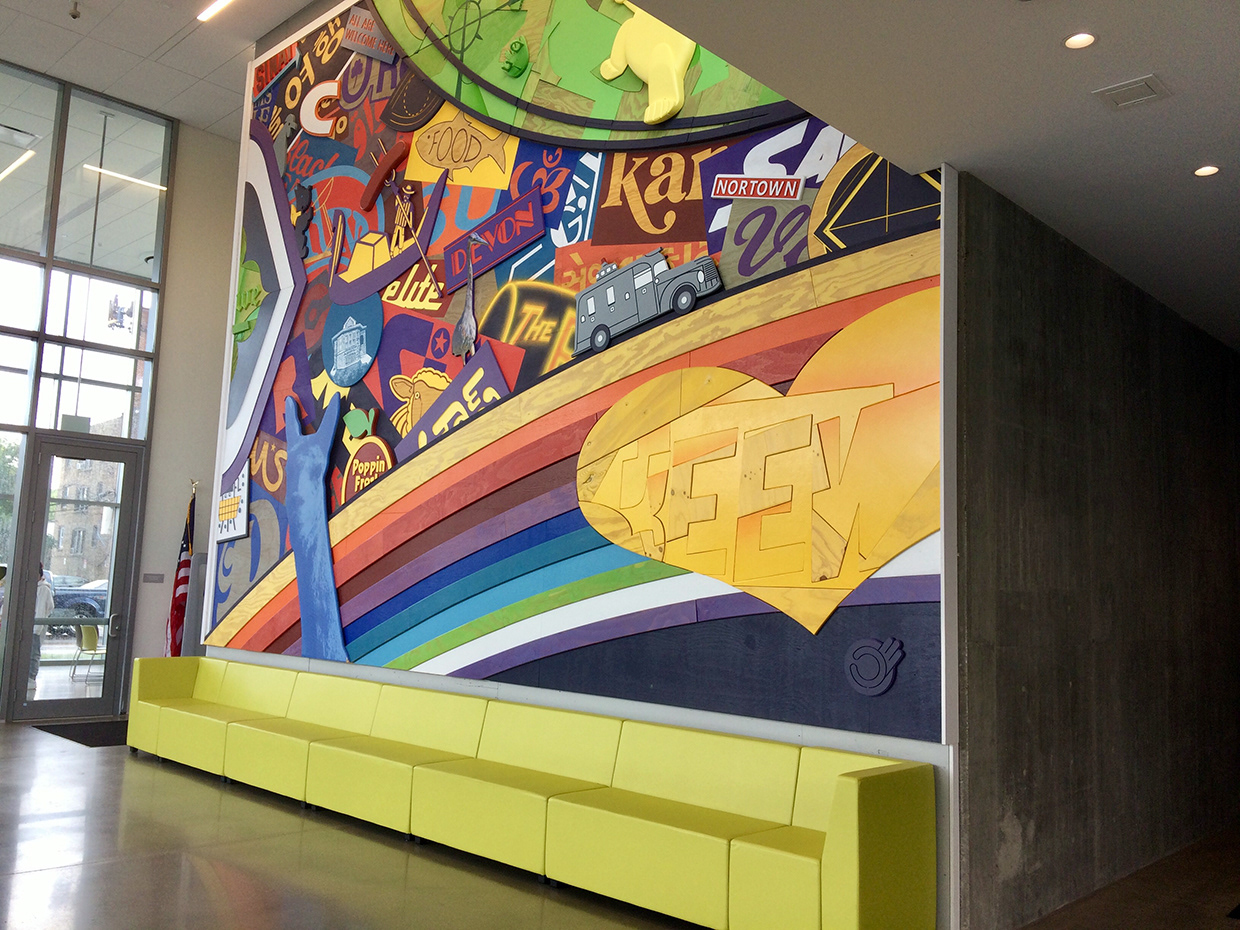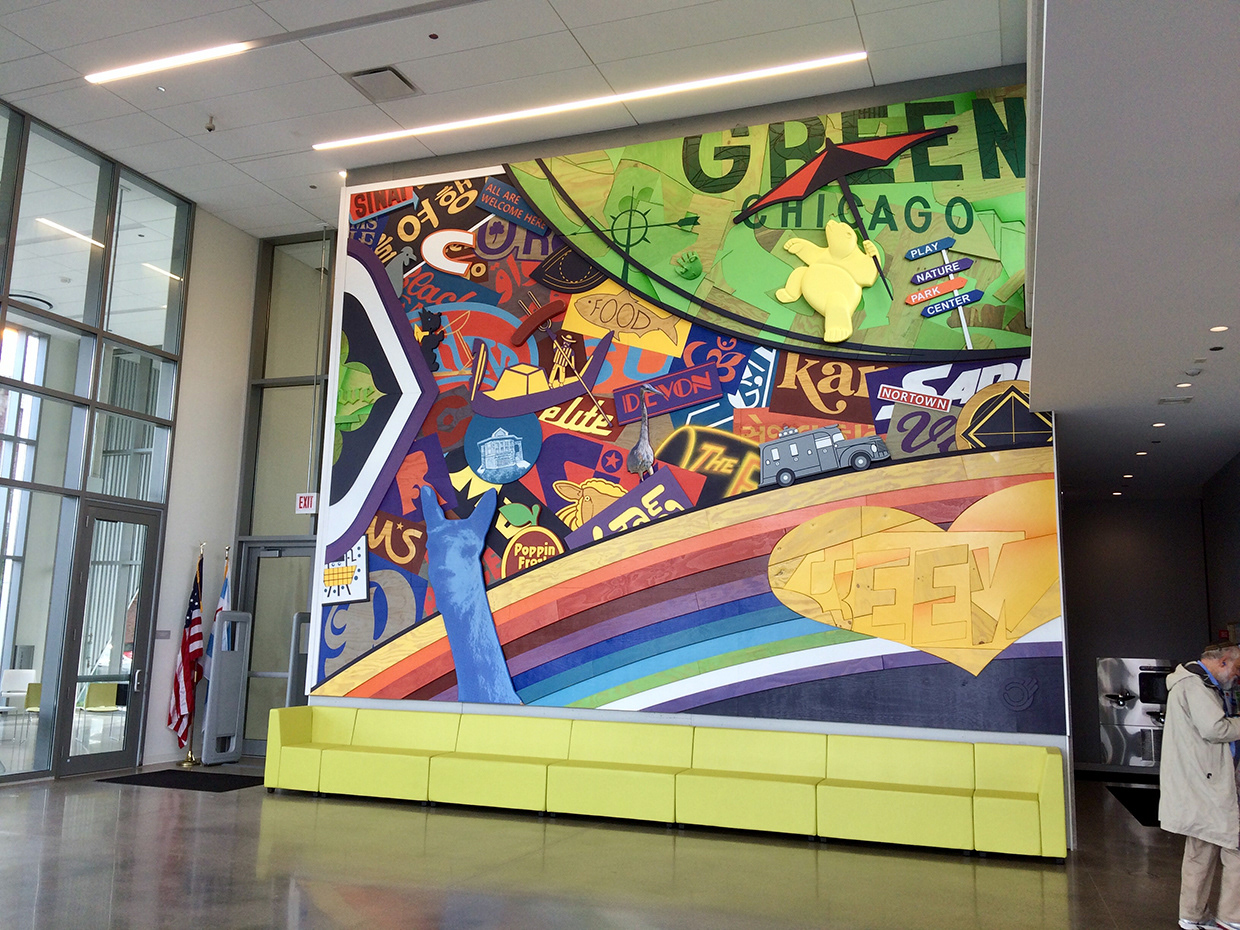 Mixed media mural installation for the new Northtown Branch of the Chicago Public Library in West Rogers Park. Collaboration with Tim Janda, with assistance from Robert Stevenson and Erik C. Harris.