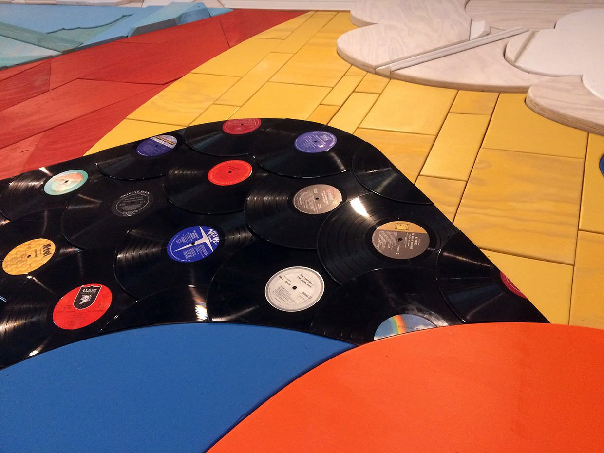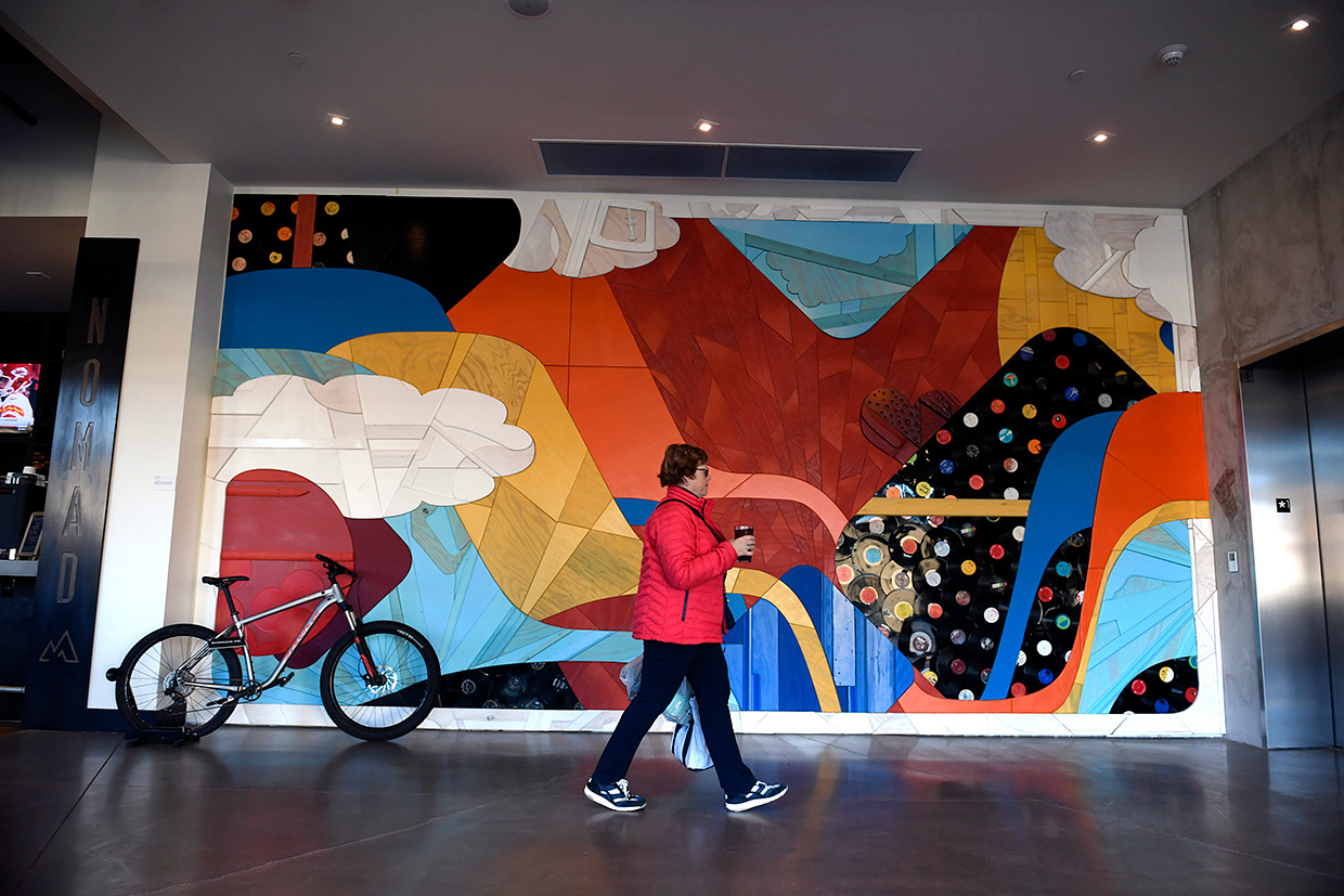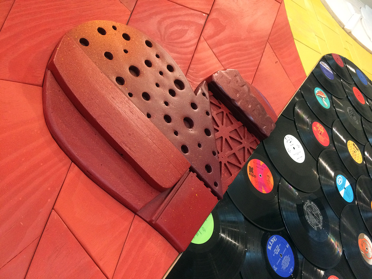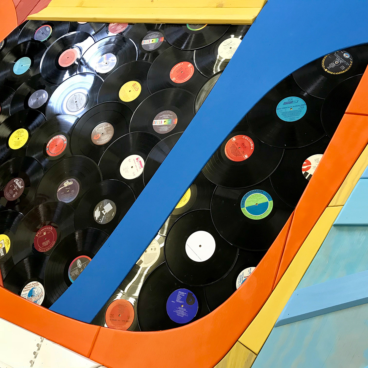 “Audio Visual” is a mixed-media installation representing Origin Red Rocks hotel's scenic location near Red Rocks Amphitheatre. composed of painted salvaged wood and repurposed vinyl records.