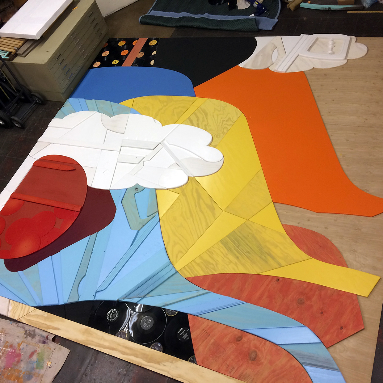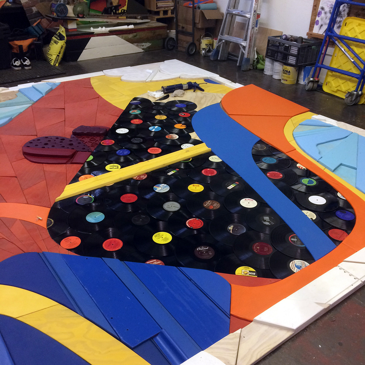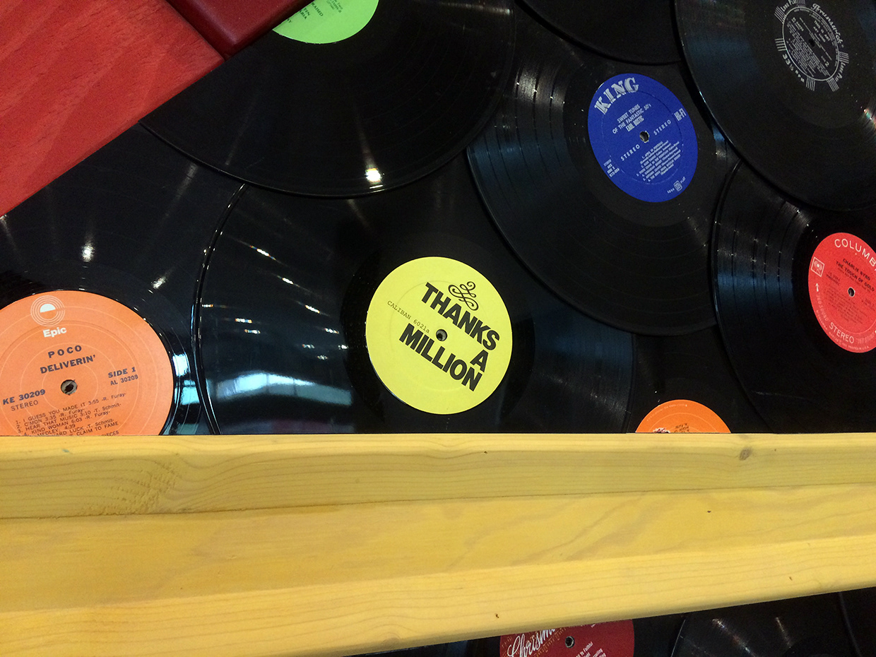 “Audio Visual” is a mixed-media installation representing Origin Red Rocks hotel's scenic location near Red Rocks Amphitheatre. composed of painted salvaged wood and repurposed vinyl records.
