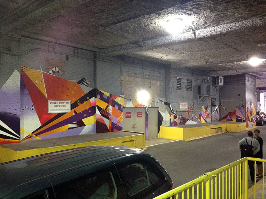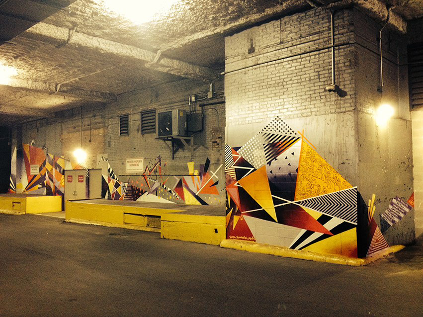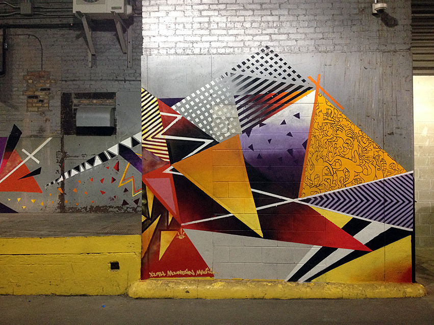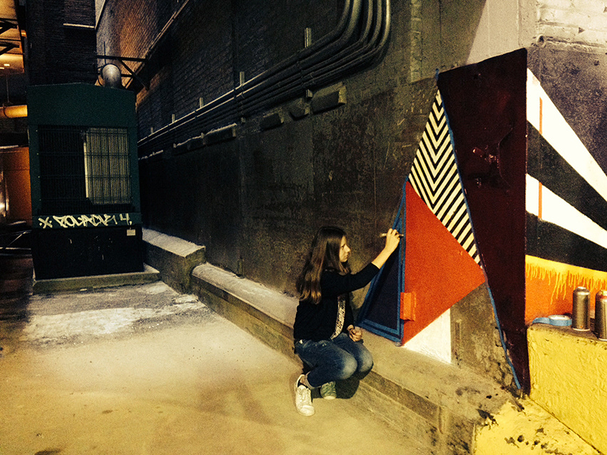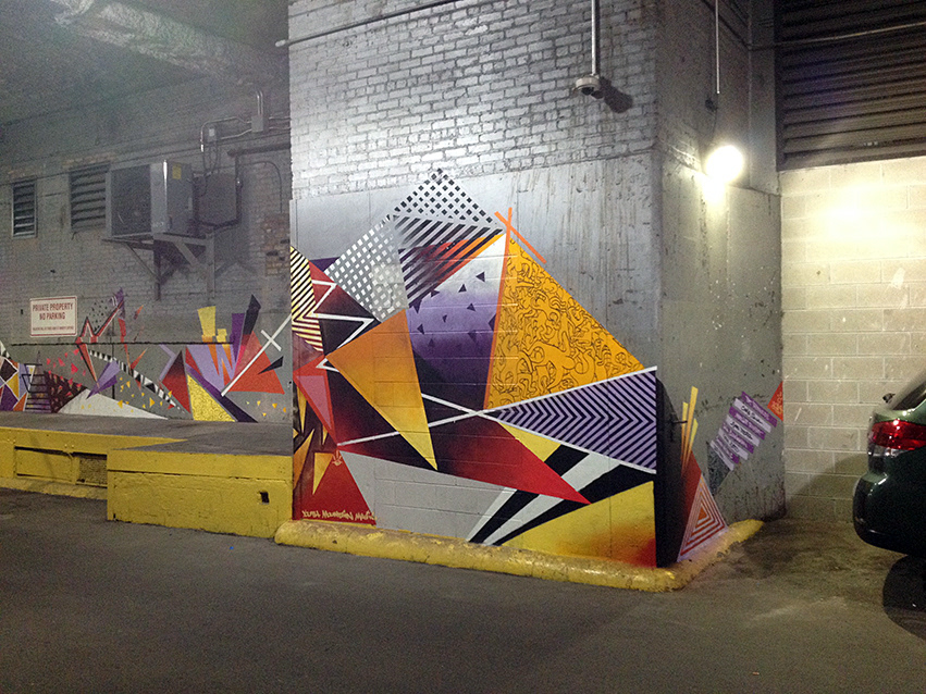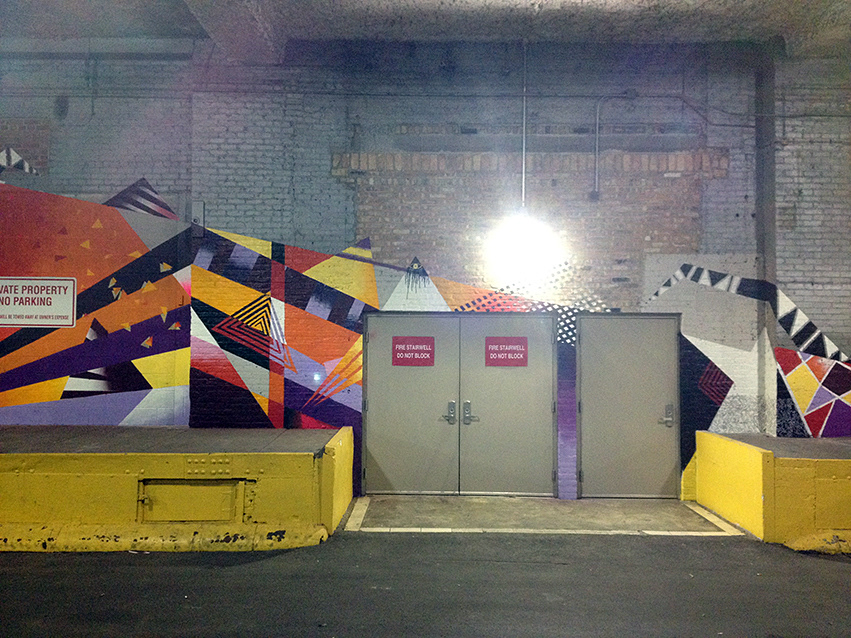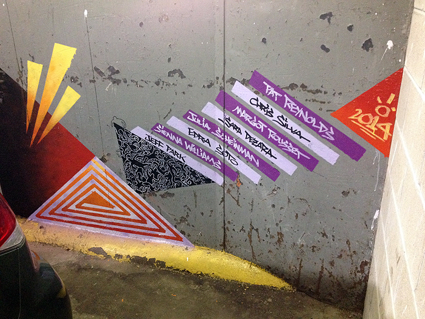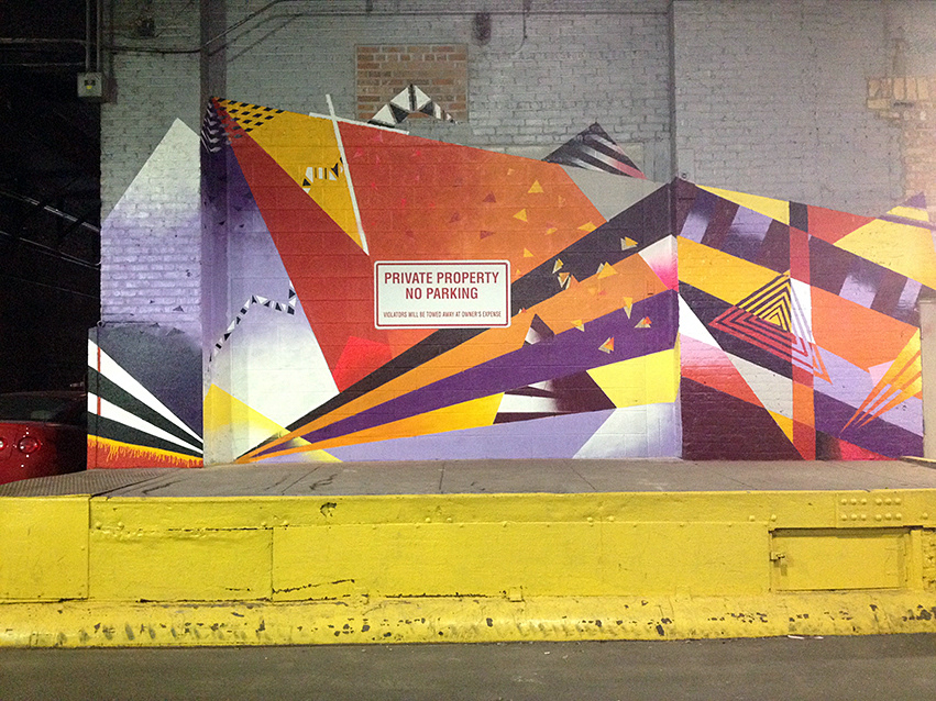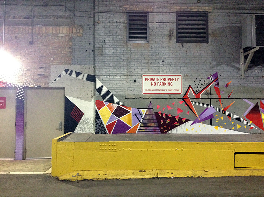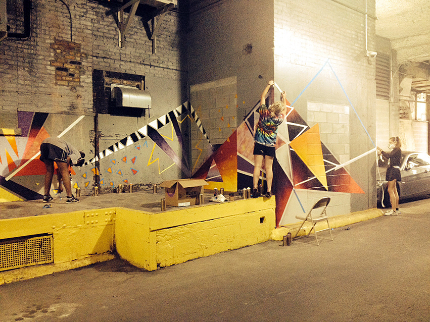 This was an Early College Program at the School Of The Art Institute at Chicago in 2014. The class was called "Art & Street Culture" and was co-taught by myself and Edra Soto along with the help of our T.A., Pat Reynolds. After a few days of collaborative exercises we brought the students to this wall and supplied them with spray paint and painters tape. I selected the palette, told them to generally limit the shapes to triangles. I drew the initial chalk lines delineating the parts of the wall which would be painted - but after that the students were given freedom to make their own decisions and sort things out as the wall progressed. We were consulted here and there for advice and technical demonstrations, but there were also times where our input was rejected entirely. It was an exciting and worthwhile adventure.